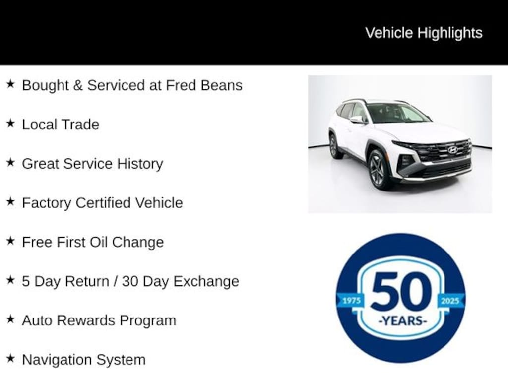 2025 Hyundai Tucson SEL Convenience SEL Convenience 2.5L I4 DGI DOHC 16V LEV3-SULEV30 187hp 8-Speed Automatic with SHIFTRONIC AWD 4D Sport Utility White Pearl Bought & Serviced at Fred Beans, Local Trade, Great Service History, Factory Certified Vehicle, Free First Oil Change, 5 Day Return / 30 Day Exchange, Auto Rewards Program, AWD, 18" Alloy Wheels, Apple CarPlay & Android Auto, Auto High-beam Headlights, Automatic temperature control, Front dual zone A/C, H-Tex Seat Trim, Heated door mirrors, Heated front seats, Illuminated entry, Leather steering wheel, Navigation System, Power door mirrors, Power driver seat, Power Liftgate, Power moonroof, Radio: AM/FM/HD Audio System, Remote keyless entry, Steering wheel mounted audio controls, Turn signal indicator mirrors.