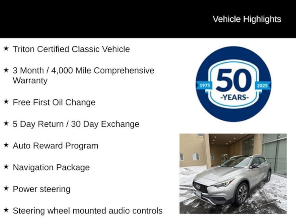 Discover the difference that Triton Certified quality and our exceptional customer service can make. Schedule a test drive today and experience the exceptional value and capabilities of this 2019 INFINITI QX30 LUXE.