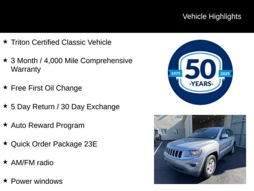Recent Arrival! 2016 Jeep Grand Cherokee Laredo 3.6L V6 24V VVT 8-Speed Automatic 4WD 4D Sport Utility Billet Silver Metallic Clearcoat Triton Certified Classic Vehicle, 3 Month / 4,000 Mile Comprehensive Warranty, Free First Oil Change, 5 Day Return / 30 Day Exchange, Auto Reward Program, 4WD, ABS brakes, AM/FM radio, Brake assist, Bright Side Roof Rails, Bumpers: body-color, Electronic Stability Control, Panic alarm, Power 4-Way Driver Lumbar Adjust, Power 8-Way Driver/Manual Passenger Seat, Power steering, Power windows, Quick Order Package 23E, Rear anti-roll bar, Remote keyless entry, Speed control, Spoiler, Steering wheel mounted audio controls.