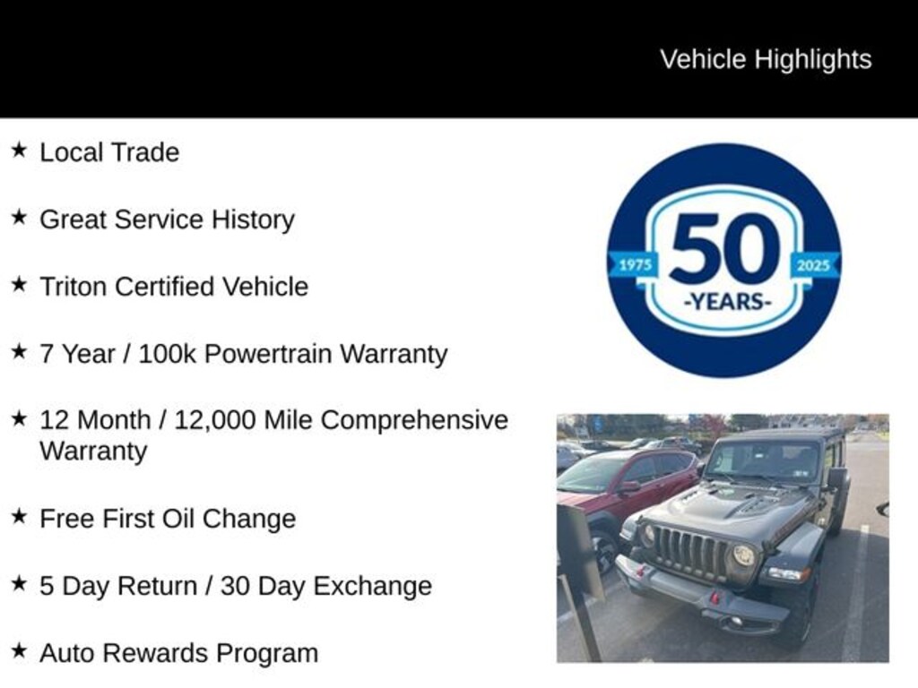Recent Arrival! 2022 Jeep Wrangler Unlimited Rubicon Unlimited Rubicon 2.0L I4 DOHC 8-Speed Automatic 4WD 4D Sport Utility Granite Crystal Metallic Clearcoat Local Trade, Great Service History, Triton Certified Vehicle, 7 Year / 100k Powertrain Warranty, 12 Month / 12,000 Mile Comprehensive Warranty, Free First Oil Change, 5 Day Return / 30 Day Exchange, Auto Rewards Program, 240 Amp Alternator, 7 & 4 Pin Wiring Harness, 700 Amp Maintenance Free Battery, Advanced Brake Assist, Advanced Safety Group, Apple CarPlay/Android Auto, Auto High Beam Headlamp Control, Auxiliary Switches, Blind Spot & Cross Path Detection, Class II Receiver Hitch, Front dual zone A/C, Full Speed Forward Collision Warning Plus, Fully automatic headlights, Heated door mirrors, Illuminated entry, Leather steering wheel, Navigation System, ParkSense Rear Park Assist System, Premium Cloth Low-Back Bucket Seats, Quick Order Package 22R, Radio: Uconnect 4C Nav w/8.4" Display, Remote keyless entry, Safety Group, Steering wheel mounted audio controls, Trailer Tow & HD Electrical Group, Wheels: 17" x 7.5" Machined w/Black Pockets.