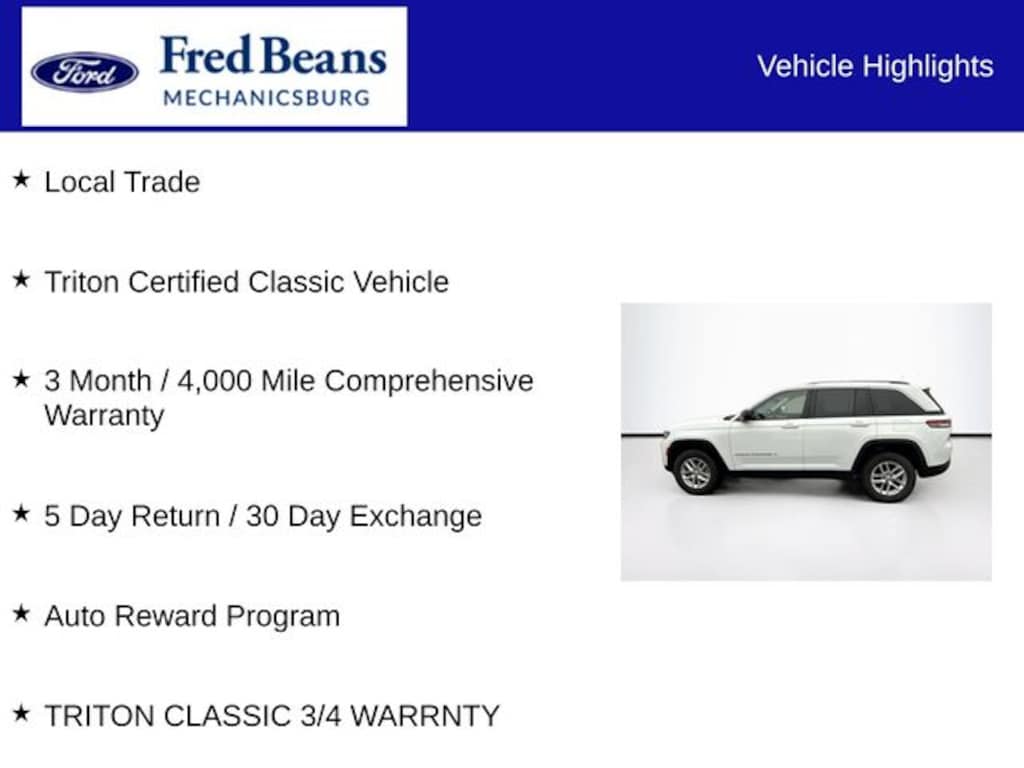 This Jeep Grand Cherokee Laredo is a Triton Certified Classic Vehicle, meaning it has undergone a rigorous 127-point inspection and comes with a 3-month/4,000-mile comprehensive warranty. You can drive with confidence knowing this SUV has been meticulously maintained and is ready to provide years of reliable service.