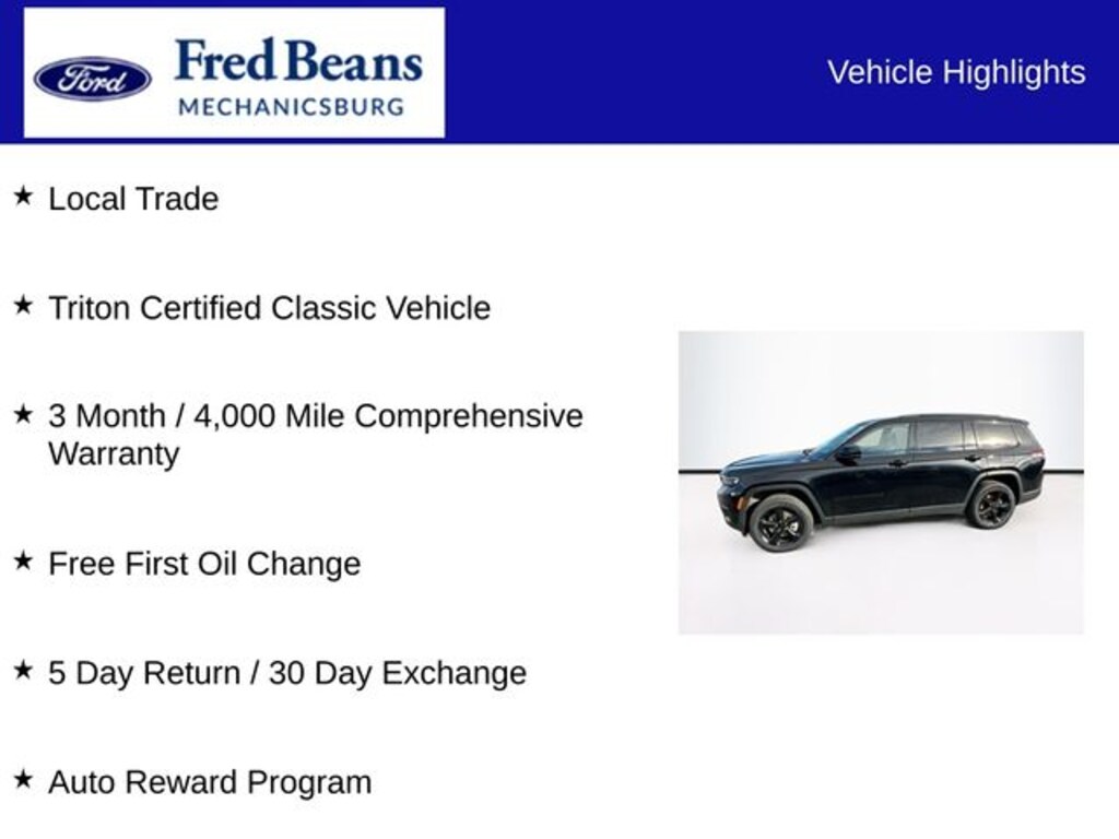 As a Triton Certified Classic Vehicle, this Grand Cherokee L has undergone a rigorous 127-point inspection and comes with a 3-month/4,000-mile comprehensive warranty. You can drive with confidence, knowing that this vehicle has been meticulously maintained and is ready to provide you with years of reliable service.