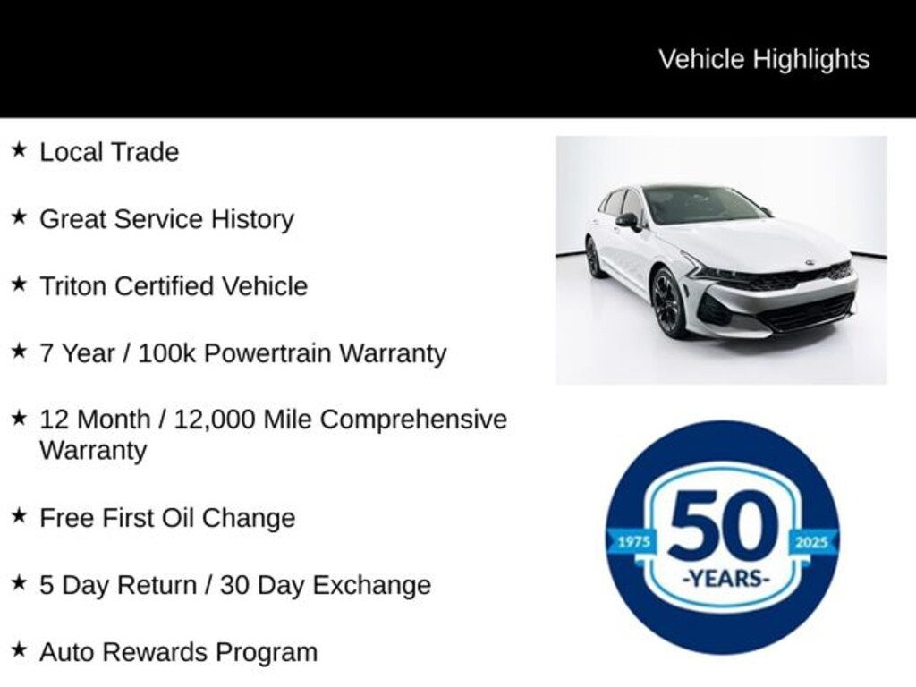 Certified. Certification Program Details: Triton Certified Shield • 7-Year or up to 100,000-Mile Powertrain Limited Warranty • 12-Month or 12,000-Mile Comprehensive Coverage ($100 deductible) • 100+ Multipoint Inspection • All Fluids Checked • Tires 6/32" or Better • 50% or Better brakes • Oil, Lube, & Filter Service Completed • PA State Inspection & Emissions Test • 5-Day Return Policy1 • 30-Day Exchange Policy2 • CARFAXTM Report • AutoRewards Membership • See salesperson for additional offers & complete details.