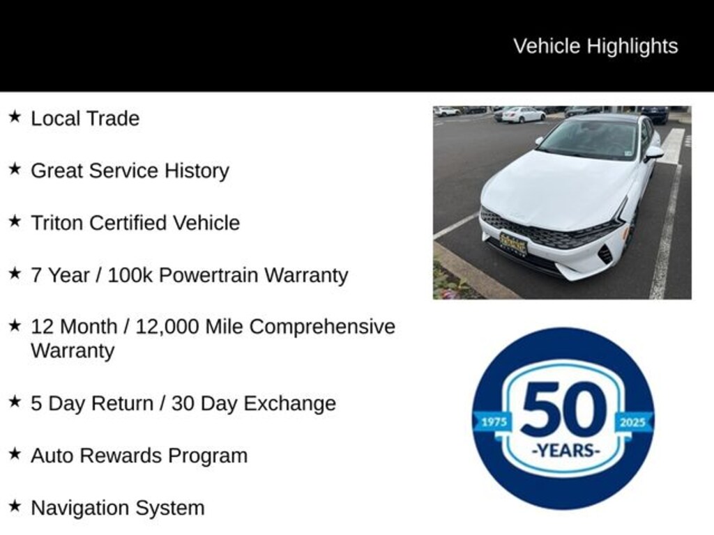 This Kia K5 EX has been meticulously inspected and certified by our Triton team, ensuring you can drive with confidence. With a comprehensive warranty and a great service history, this vehicle is ready to provide you with years of reliable and enjoyable ownership.