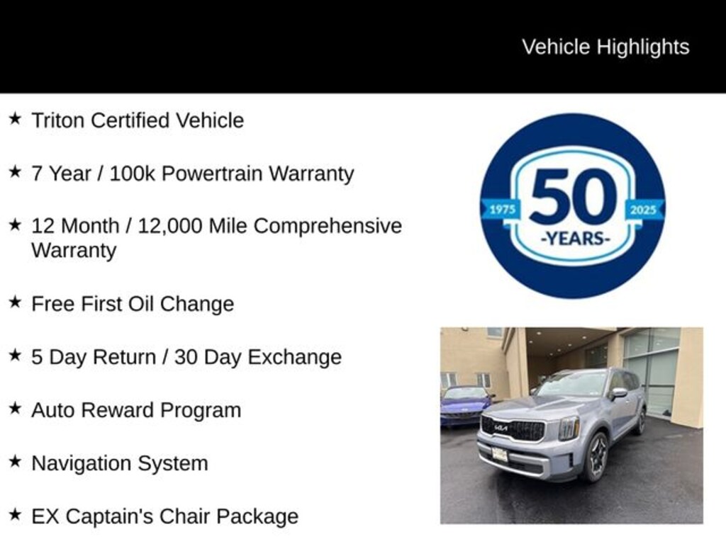 Recent Arrival! 2023 Kia Telluride EX 3.8L V6 DGI DOHC Dual CVVT 8-Speed Automatic AWD 4D Sport Utility Everlasting Silver Triton Certified Vehicle, 7 Year / 100k Powertrain Warranty, 12 Month / 12,000 Mile Comprehensive Warranty, Free First Oil Change, 5 Day Return / 30 Day Exchange, Auto Reward Program, 2nd Row Captain Chairs, ABS brakes, Apple CarPlay & Android Auto, Emergency communication system: 911 Connect, EX Captain's Chair Package, Exterior Parking Camera Rear, Heated & Ventilated Front Bucket Seats, Navigation System, Power driver seat, Power Liftgate, Power moonroof, Power steering, Power windows, Remote keyless entry, Roof rack: rails only, Smart Key w/ Push Button and Remote Start, Steering wheel mounted audio controls.