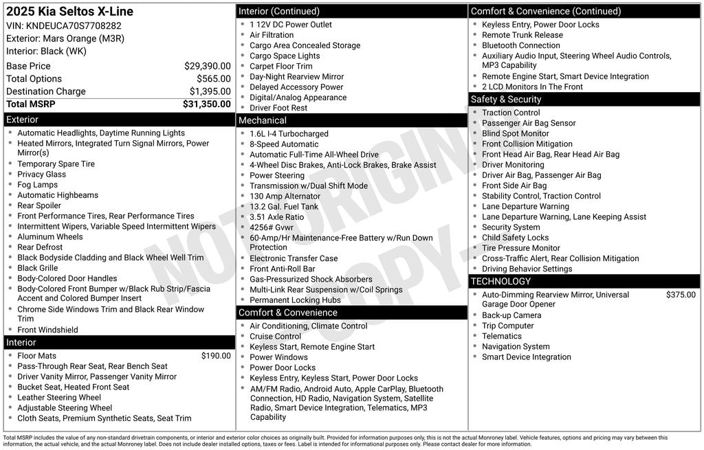 2025 Kia Seltos X-Line I4 8-Speed Automatic AWD 4D Sport Utility Mars Orange 24/27 City/Highway MPG 24/27 City/Highway MPG Kia Certified Pre-Owned Certified, Apple CarPlay & Android Auto, Exterior Parking Camera Rear, Front fog lights, Fully automatic headlights, Heated front seats, Leather steering wheel, Navigation System, 4-Wheel Disc Brakes, 6 Speakers, ABS brakes, Air Conditioning, Alloy wheels, AM/FM radio: SiriusXM, Auto High-beam Headlights, Automatic temperature control, Brake assist, Bumpers: body-color, Carpet Floor Mats, Cloth & Artificial Leather Seat Trim, Delay-off headlights, Driver door bin, Driver vanity mirror, Dual front impact airbags, Dual front side impact airbags, EC Mirror w/Homelink, Electronic Stability Control, Emergency communication system: 911 Connect, Four wheel independent suspension, Front anti-roll bar, Front Bucket Seats, Front Center Armrest, Front reading lights, Heated door mirrors, Heated Front Bucket Seats (3-Steps), Illuminated entry, Leather Shift Knob, Low tire pressure warning, Occupant sensing airbag, Outside temperature display, Overhead airbag, Overhead console, Panic alarm, Passenger door bin, Passenger vanity mirror, Power door mirrors, Power steering, Power windows, Radio: AM/FM/HD/Satellite Display System w/Navigation, Rear seat center armrest, Rear window defroster, Rear window wiper, Remote keyless entry, Security system, Speed control, Speed-sensing steering, Split folding rear seat, Spoiler, Steering wheel mounted audio controls, Tachometer, Telescoping steering wheel, Tilt steering wheel, Traction control, Trip computer, Turn signal indicator mirrors, Variably intermittent wipers, Wheels: 18" Alloy w/Gloss Black Finish, Apple CarPlay & Android Auto, Exterior Parking Camera Rear, Front fog lights, Fully automatic headlights, Heated front seats, Leather steering wheel, Navigation System.