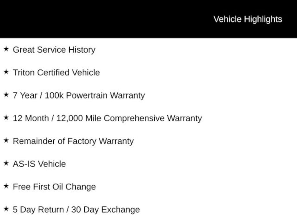 Certified. Certification Program Details: Triton Certified Shield ⢠7-Year or up to 100,000-Mile Powertrain Limited Warranty ⢠12-Month or 12,000-Mile Comprehensive Coverage ($100 deductible) ⢠100+ Multipoint Inspection ⢠All Fluids Checked ⢠Tires 6/32" or Better ⢠50% or Better brakes ⢠Oil, Lube, & Filter Service Completed ⢠PA State Inspection & Emissions Test ⢠5-Day Return Policy1 ⢠30-Day Exchange Policy2 ⢠CARFAXTM Report ⢠AutoRewards Membership ⢠See salesperson for additional offers & complete details.
