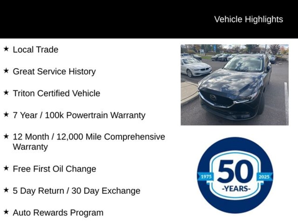 Recent Arrival! 2019 Mazda CX-5 Grand Touring Reserve Grand Touring Reserve 2.5L 4-Cylinder 6-Speed Automatic AWD 4D Sport Utility Jet Black Mica Local Trade, Great Service History, Triton Certified Vehicle, 7 Year / 100k Powertrain Warranty, 12 Month / 12,000 Mile Comprehensive Warranty, Free First Oil Change, 5 Day Return / 30 Day Exchange, Auto Rewards Program, AppLink/Apple CarPlay and Android Auto, Auto High-beam Headlights, Bose 10-Speaker Audio Sound System, Exterior Parking Camera Rear, Front dual zone A/C, Fully automatic headlights, Heads-Up Display, Heated door mirrors, Heated rear seats, Illuminated entry, Leather Seat Trim, Leather Shift Knob, Mazda Navigation System, Memory seat, Navigation system: MAZDA CONNECT, Power door mirrors, Power driver seat, Power Liftgate, Power moonroof, Power passenger seat, Radio: AM/FM/HD Audio System, Rain sensing wipers, Steering wheel mounted audio controls, Turn signal indicator mirrors, Ventilated front seats, Wheels: 19" x 7J Aluminum Alloy w/Silver Finish.