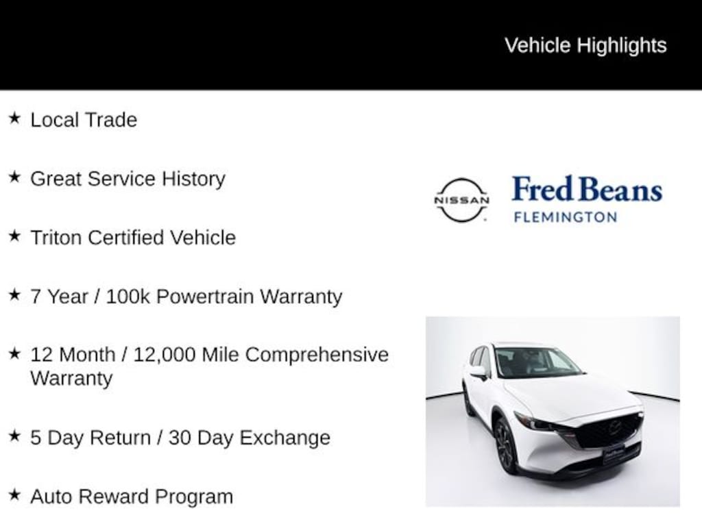 2023 Mazda CX-5 2.5 S Premium Plus Package 2.5 S Premium Plus Package SKYACTIV® 2.5L 4-Cylinder DOHC 16V 6-Speed Automatic AWD 4D Sport Utility Rhodium White Metallic Local Trade, Great Service History, Triton Certified Vehicle, 7 Year / 100k Powertrain Warranty, 12 Month / 12,000 Mile Comprehensive Warranty, 5 Day Return / 30 Day Exchange, Auto Reward Program.