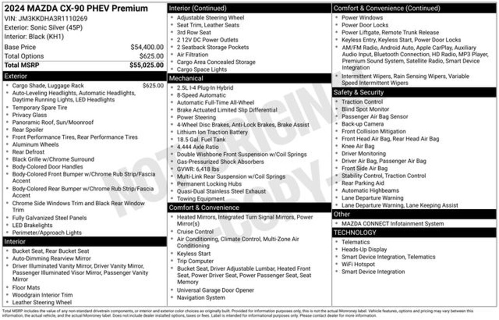 Recent Arrival! 2024 Mazda CX-90 PHEV Premium 2.5L I4 DOHC 16V LEV3-SULEV30 8-Speed Automatic AWD 4D Sport Utility Sonic Silver