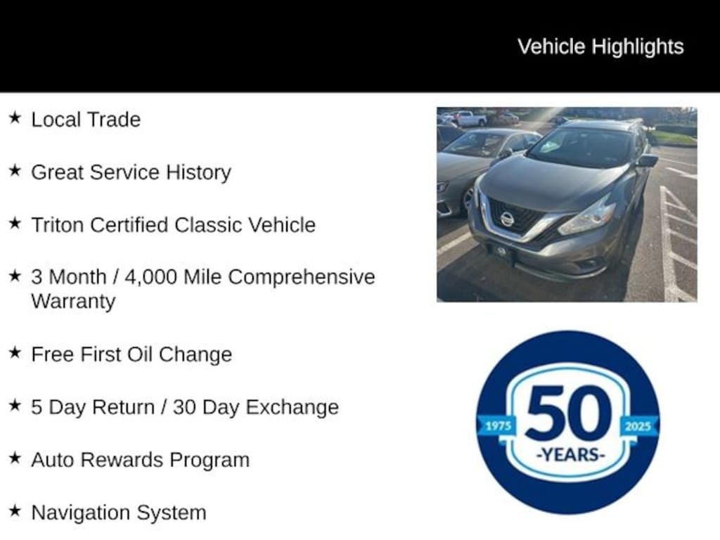 2016 Nissan Murano SL SL 3.5L V6 DOHC CVT with Xtronic AWD 4D Sport Utility Gun Metallic Local Trade, Great Service History, Triton Certified Classic Vehicle, 3 Month / 4,000 Mile Comprehensive Warranty, Free First Oil Change, 5 Day Return / 30 Day Exchange, Auto Rewards Program, CVT with Xtronic, AWD, Alloy wheels, Auto-dimming Rear-View mirror, Front dual zone A/C, Fully automatic headlights, Heated door mirrors, Heated front seats, Illuminated entry, Leather Appointed Seat Trim, Leather Shift Knob, Memory seat, Navigation System, Power door mirrors, Power driver seat, Power Liftgate, Radio: AM/FM/CD Audio System w/Navigation, Remote keyless entry, Steering wheel mounted audio controls, Turn signal indicator mirrors.