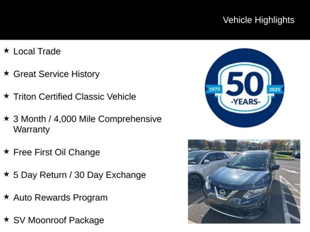 Recent Arrival! 2016 Nissan Rogue SV SV 2.5L I4 DOHC 16V CVT with Xtronic FWD 4D Sport Utility Arctic Blue Metallic Local Trade, Great Service History, Triton Certified Classic Vehicle, 3 Month / 4,000 Mile Comprehensive Warranty, Free First Oil Change, 5 Day Return / 30 Day Exchange, Auto Rewards Program, Alloy wheels, AroundView Monitor, Blind Spot Warning, Front dual zone A/C, Fully automatic headlights, Heated Outside Mirrors, Heated Seats, Illuminated entry, Power door mirrors, Power driver seat, Power Liftgate, Power Panoramic Moonroof, Radio: AM/FM/CD/RDS/AUX NissanConnect w/Navigation, Remote keyless entry, Steering wheel mounted audio controls, SV Moonroof Package, SV Premium Package, Turn signal indicator mirrors.