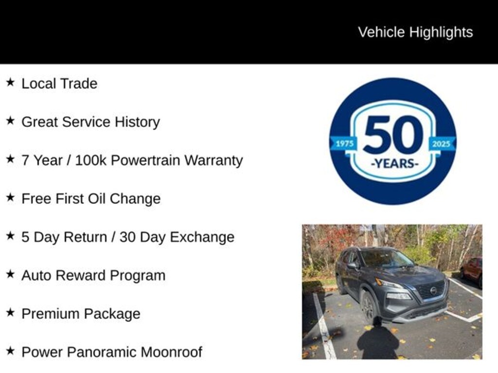 Recent Arrival! 2021 Nissan Rogue SV 2.5L I4 DOHC 16V CVT with Xtronic AWD 4D Sport Utility Gun Metallic Local Trade, Great Service History, 7 Year / 100k Powertrain Warranty, Free First Oil Change, 5 Day Return / 30 Day Exchange, Auto Reward Program, AWD, Heated Driver & Front Passenger Seats, Heated Leather-Wrapped Steering Wheel, Leatherette Seat Trim, Power Liftgate, Power Panoramic Moonroof, Premium Package, Roof Rails, Second Row Sunshades.