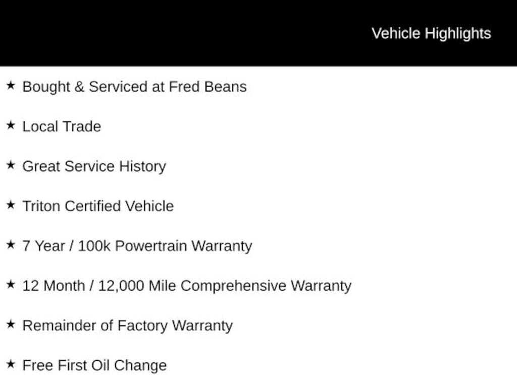 Certified. Certification Program Details: Triton Certified Shield ⢠7-Year or up to 100,000-Mile Powertrain Limited Warranty ⢠12-Month or 12,000-Mile Comprehensive Coverage ($100 deductible) ⢠100+ Multipoint Inspection ⢠All Fluids Checked ⢠Tires 6/32" or Better ⢠50% or Better brakes ⢠Oil, Lube, & Filter Service Completed ⢠PA State Inspection & Emissions Test ⢠5-Day Return Policy1 ⢠30-Day Exchange Policy2 ⢠CARFAXTM Report ⢠AutoRewards Membership ⢠See salesperson for additional offers & complete details.