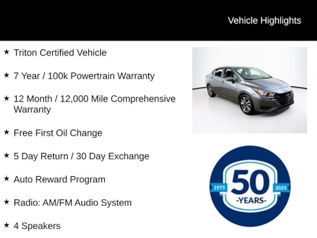 2023 Nissan Versa 1.6 SV 1.6L 4-Cylinder DOHC 16V CVT FWD 4D Sedan Gun Metallic Triton Certified Vehicle, 7 Year / 100k Powertrain Warranty, 12 Month / 12,000 Mile Comprehensive Warranty, Free First Oil Change, 5 Day Return / 30 Day Exchange, Auto Reward Program, 16" Alloy Wheels, 4 Speakers, ABS brakes, Air Conditioning, Apple CarPlay/Android Auto, Blind Spot Warning, Brake assist, Dual front side impact airbags, Electronic Stability Control, Front anti-roll bar, Front Bucket Seats, Front wheel independent suspension, Fully automatic headlights, Heated door mirrors, Knee airbag, Low tire pressure warning, Occupant sensing airbag, Outside temperature display, Overhead airbag, Power door mirrors, Power steering, Power windows, Radio data system, Radio: AM/FM Audio System, Rear Parking Sensors, Rear side impact airbag, Rear window defroster, Remote keyless entry, Speed control, Split folding rear seat, Steering wheel mounted audio controls, Telescoping steering wheel, Tilt steering wheel, Traction control, Upgraded Cloth Seat Trim.