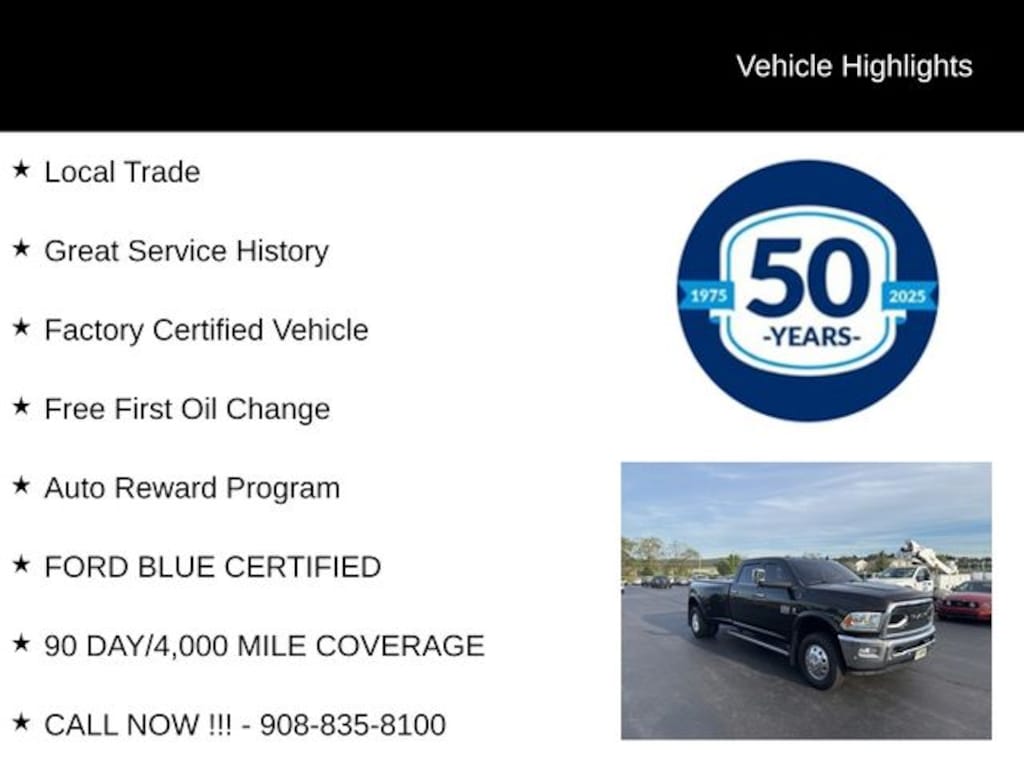 Recent Arrival! 2018 Ram 3500 Laramie Longhorn Cummins 6.7L I6 Turbodiesel Aisin 6-Speed Automatic 4WD 4D Crew Cab Brilliant Black Crystal Pearlcoat Factory Certified Vehicle, Free First Oil Change, Auto Reward Program, Local Trade, Great Service History, FORD BLUE CERTIFIED, 90 DAY/4,000 MILE COVERAGE, CALL NOW !!! - 908-835-8100, 10 Speakers, 115V Auxiliary Power Outlet, 4-Wheel Disc Brakes, 4.10 Axle Ratio, 5th Wheel/Gooseneck Towing Prep Group, 6000# Front Axle w/Hub Ext, ABS brakes, Adjustable pedals, Air Conditioning, Alloy wheels, AM/FM radio: SiriusXM, Apple CarPlay/Android Auto, Audio memory, Auto High Beam Headlamp Control, Auto Level Rear Air Suspension, Auto-dimming Rear-View mirror, Automatic temperature control, Box & Rear Fender Clearance Lamps, Brake assist, Bucket Seats, Center Hub, Chrome Belt Moldings, Chrome Tubular Side Steps, Clearance Lamps, Compass, Convenience Group, CTR Stop Lamp w/Cargo View Camera, Delay-off headlights, Driver door bin, Driver vanity mirror, Dual Alternators Rated At 440 Amps, Dual front impact airbags, Dual front side impact airbags, Dual Rear Wheel Fender Flare Tracking, Dual Rear Wheels, Electronic Stability Control, Electronically Controlled Throttle, Emergency communication system: SiriusXM Guardian, Folding Flat Load Floor Storage, Front anti-roll bar, Front Bucket Seats, Front Center Armrest w/Storage, Front dual zone A/C, Front fog lights, Front reading lights, Fully automatic headlights, Garage door transmitter, Genuine wood console insert, Genuine wood dashboard insert, Genuine wood door panel insert, Heated door mirrors, Heated Front Seats, Heated front seats, Heated rear seats, Heated Second Row Seats, Heated Steering Wheel, Heated steering wheel, Heavy Duty Snow Plow Prep Group, Hemi Badge, High Back Seats, I/P Mounted Auxiliary Switches, Illuminated entry, Keyless Enter-N-Go, Leather steering wheel, Low tire pressure warning, Memory seat, Navigation System, Occupant sensing airbag, Outside temperature display, Overhead airbag, Overhead console, Panic alarm, ParkView Rear Back-Up Camera, Passenger door bin, Passenger vanity mirror, Pedal memory, Power 10-Way Memory Driver & 6-Way Passenger Seats, Power door mirrors, Power driver seat, Power Lumbar Adjust, Power passenger seat, Power steering, Power Sunroof, Power windows, Premium Filigree Leather Seats, Protection Group, Quick Order Package 28K Laramie Longhorn, Radio data system, Radio: Uconnect 4C Nav w/8.4" Display, Rain Sensitive Windshield Wipers, Rear 60/40 Split Folding Seat, Rear reading lights, Rear seat center armrest, Rear step bumper, Rear Window Defroster, Remote keyless entry, Remote Proximity Keyless Entry, Security system, Speed control, Split folding rear seat, Steering wheel mounted audio controls, Tachometer, Tilt steering wheel, Tip Start, Tire Pressure Monitoring Delete, Traction control, Trailer Brake Control, Trip computer, Turn signal indicator mirrors, Variably intermittent wipers, Ventilated Front Seats, Ventilated front seats, Voltmeter, Wheels: 17" x 6.0" Premium Aluminum.