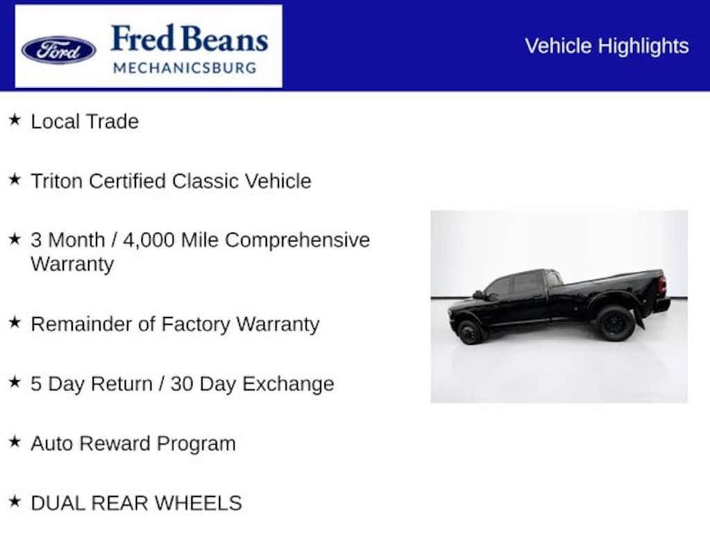 As a Triton Certified Classic Vehicle, this 2022 Ram 3500 Limited has undergone a rigorous 127-point inspection and comes with a 3-month/4,000-mile comprehensive warranty, giving you the peace of mind of a like-new vehicle. Plus, the remainder of the factory warranty is still in effect, ensuring you're covered for years to come.