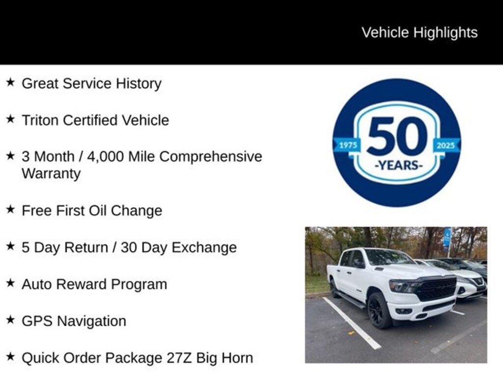 Recent Arrival! 2023 Ram 1500 Big Horn/Lone Star HEMI 5.7L V8 Multi Displacement VVT eTorque 8-Speed Automatic 4WD 4D Crew Cab Bright White Clearcoat Great Service History, Triton Certified Vehicle, 3 Month / 4,000 Mile Comprehensive Warranty, Free First Oil Change, 5 Day Return / 30 Day Exchange, Auto Reward Program, 115V Auxiliary Power Outlet, 2nd Row In Floor Storage Bins, 400W Inverter, 9 Amplified Speakers w/Subwoofer, Accent Color Door Handles, Accent Color Premium Power Mirrors, Air Conditioning ATC w/Dual Zone Control, Anti-Spin Differential Rear Axle, Auto-Dimming Exterior Driver Mirror, Auto-Dimming Rear-View Mirror, Big Horn Badge, Big Horn Level B Equipment Group, Black Exterior Mirrors, Black Exterior Truck Badging, Black Headlamp Bezels, Black Interior Accents, Black Painted Exterior Mirrors Caps, Black Premium Power Mirrors, Body Color Front Bumper, Body Color Rear Bumper w/Step Pads, Class IV Receiver Hitch, Cluster 7.0" TFT Color Display, Convex Wide-Angle Exterior Mirror Insert, Deluxe Cloth Bucket Seats, Dual Exhaust w/Black Tips, Exterior Mirrors Courtesy Lamps, Exterior Mirrors w/Heating Element, Exterior Mirrors w/Supplemental Signals, Front Fog Lamps, Global Telematics Box Module (TBM), Glove Box Lamp, GPS Navigation, Heated Front Seats, Heated Steering Wheel, LED Footwell Lighting, Media Hub w/2 Charge Only USBs, Night Edition, ParkSense Front/Rear Park Assist w/Stop, Power 2-Way Driver Lumbar Adjust, Power 8-Way Driver Seat, Power Adjustable Pedals, Power-Folding Mirrors, Quick Order Package 27Z Big Horn, Radio: Uconnect 5 Nav w/12.0" Display, RAM Grille Badge - Black, Rear Dome w/On/Off Switch Lamp, Rear Power Sliding Window, Rear Window Defroster, Remote Start System, Security Alarm, SiriusXM Radio Service, SiriusXM Satellite Radio, Sun Visors w/Illuminated Vanity Mirrors, Universal Garage Door Opener, Wheels: 20" x 9.0" Premium Paint/Polished.