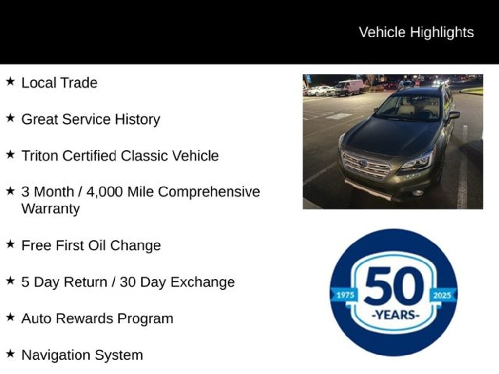 Recent Arrival! 2017 Subaru Outback 2.5i Limited 2.5i 2.5L 4-Cylinder DOHC 16V CVT Lineartronic AWD 4D Sport Utility Wilderness Green Metallic Local Trade, Great Service History, Triton Certified Classic Vehicle, 3 Month / 4,000 Mile Comprehensive Warranty, Free First Oil Change, 5 Day Return / 30 Day Exchange, Auto Rewards Program, Aha, Exterior Auto Dimming Mirror For BSD, Exterior Parking Camera Rear, Eyesight & Navigation & HBA & RAB & HID Lights, Front dual zone A/C, Heated front seats, Heated rear seats, High Beam Assist, High-Intensity Discharge Headlights, Illuminated entry, Leather Shift Knob, Memory seat, Navigation System, Perforated Leather-Trimmed Upholstery, Power door mirrors, Power driver seat, Power Liftgate, Power moonroof, Power passenger seat, Radio: Subaru Starlink 7.0" Multimedia Nav System, Reverse Auto Brake, Smartphone Integration, Steering wheel mounted audio controls, Turn signal indicator mirrors, Wheels: 18" x 7.0" Aluminum Alloy w/Machine Finish.