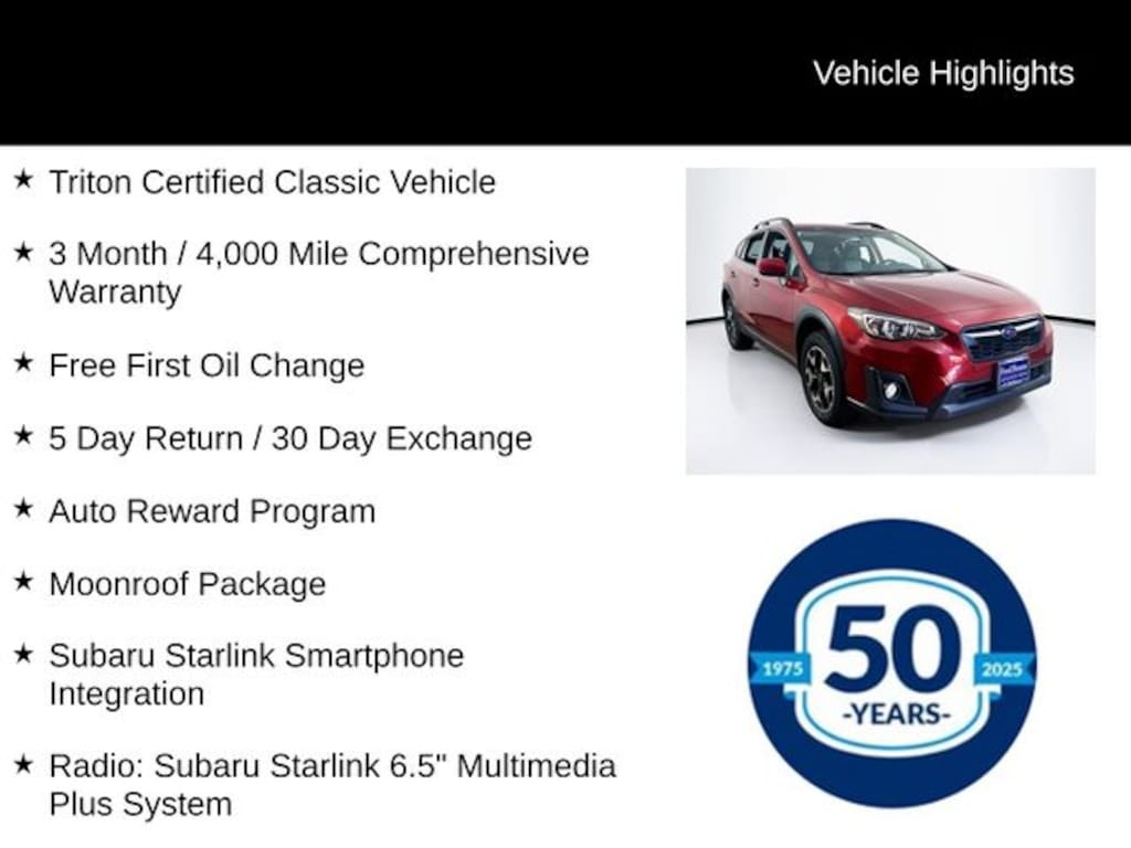 2019 Subaru Crosstrek 2.0i Premium 2.0L DOHC Lineartronic CVT AWD 4D Sport Utility Venetian Red Pearl Triton Certified Classic Vehicle, 3 Month / 4,000 Mile Comprehensive Warranty, Free First Oil Change, 5 Day Return / 30 Day Exchange, Auto Reward Program, ABS brakes, All-Weather Floor Liners, Blind Spot Detection/Rear Cross Traffic Alert, Emergency communication system: STARLINK Safety and Security, Exterior Parking Camera Rear, Heated Front Bucket Seats, Moonroof Package, Power Moonroof, Power steering, Power windows, Radio: Subaru Starlink 6.5" Multimedia Plus System, Rear Bumper Cover, Remote keyless entry, Roof rack: rails only, Speed control, Steering wheel mounted audio controls, Subaru Starlink Smartphone Integration.