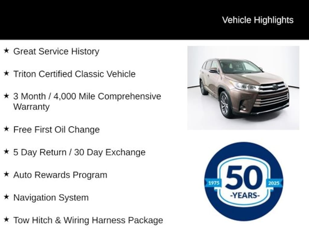 2017 Toyota Highlander XLE XLE 3.5L V6 8-Speed Automatic Electronic with ECT-i AWD 4D Sport Utility Brown Great Service History, Triton Certified Classic Vehicle, 3 Month / 4,000 Mile Comprehensive Warranty, Free First Oil Change, 5 Day Return / 30 Day Exchange, Auto Rewards Program, AWD, ABS brakes, Active Cruise Control, Alloy wheels, Auto High-beam Headlights, Electronic Stability Control, Exterior Parking Camera Rear, Front dual zone A/C, Front fog lights, Heated door mirrors, Heated Front Bucket Seats, Heated front seats, Illuminated entry, Leather Seat Trim, Low tire pressure warning, Navigation System, Power driver seat, Power Liftgate, Power moonroof, Power passenger seat, Radio: Entune Premium Audio w/Nav & App Suite, Reclining 3rd row seat, Remote keyless entry, Security system, Split folding rear seat, Steering wheel mounted audio controls, Telescoping steering wheel, Tilt steering wheel, Tow Hitch, Tow Hitch & Wiring Harness Package, Traction control, Turn signal indicator mirrors, Wiring Harness.