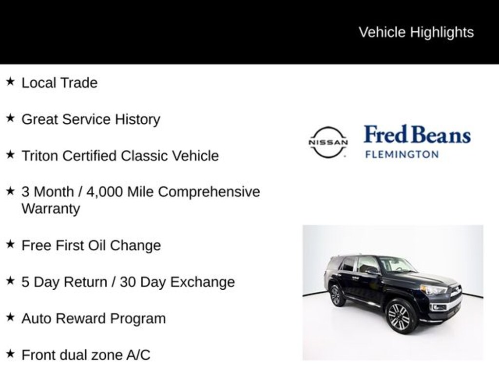 2018 Toyota 4Runner Limited Limited 4.0L V6 SMPI DOHC 5-Speed Automatic with Overdrive 4WD 4D Sport Utility Black Local Trade, Great Service History, Triton Certified Classic Vehicle, 3 Month / 4,000 Mile Comprehensive Warranty, Free First Oil Change, 5 Day Return / 30 Day Exchange, Auto Reward Program, 4WD, Redwood Leather, 20" x 7.5" Unique Dual 6-Spoke Alloy Wheels, ABS brakes, Alloy wheels, Body Color Heated Mirrors, Compass, Electronic Stability Control, Front dual zone A/C, Heated door mirrors, Heated front seats, Heated/Ventilated Front Bucket Seats, Illuminated entry, Leather Seat Trim, Low tire pressure warning, Power moonroof, Remote keyless entry, Traction control.
