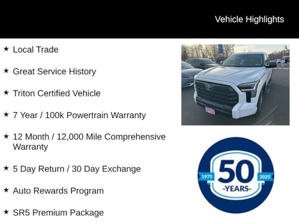 As a Triton Certified vehicle, this Tundra has undergone a comprehensive inspection and reconditioning process, ensuring it meets the highest standards of quality and reliability. You can trust that this truck has been meticulously cared for and is ready to provide you with years of dependable service.