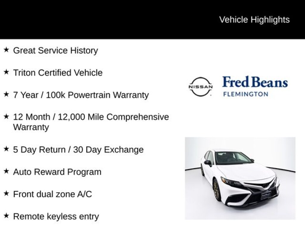2023 Toyota Camry SE Nightshade SE Nightshade 2.5L I4 DOHC 16V 8-Speed Automatic AWD 4D Sedan White Great Service History, Triton Certified Vehicle, 7 Year / 100k Powertrain Warranty, 12 Month / 12,000 Mile Comprehensive Warranty, 5 Day Return / 30 Day Exchange, Auto Reward Program, Black Artificial Leather, ABS brakes, Active Cruise Control, Alloy wheels, Electronic Stability Control, Front dual zone A/C, Heated door mirrors, Illuminated entry, Low tire pressure warning, Remote keyless entry, Traction control.