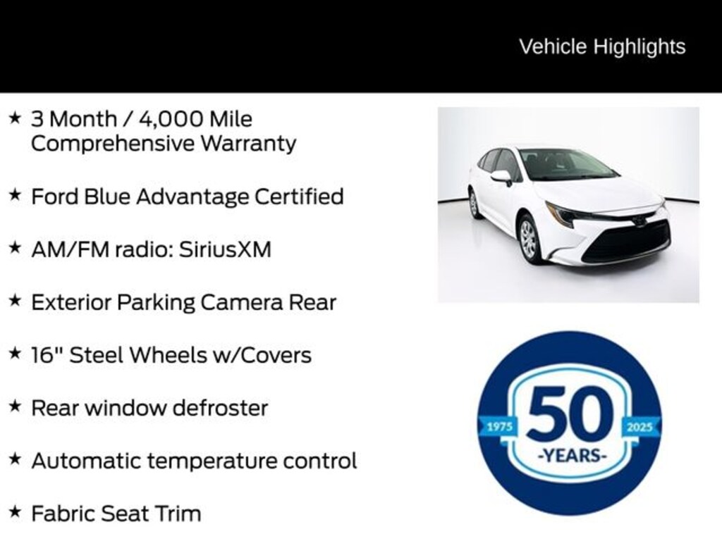 2024 Toyota Corolla LE 2.0L I4 DOHC 16V CVT FWD 4D Sedan Ice Cap 3 Month / 4,000 Mile Comprehensive Warranty, Ford Blue Advantage Certified, 16" Steel Wheels w/Covers, AM/FM radio: SiriusXM, Automatic temperature control, Exterior Parking Camera Rear, Fabric Seat Trim, Front Bucket Seats, Front Center Armrest, Power door mirrors, Power windows, Rear window defroster, Remote keyless entry, Speed control, Tilt steering wheel. 32/41 City/Highway MPG