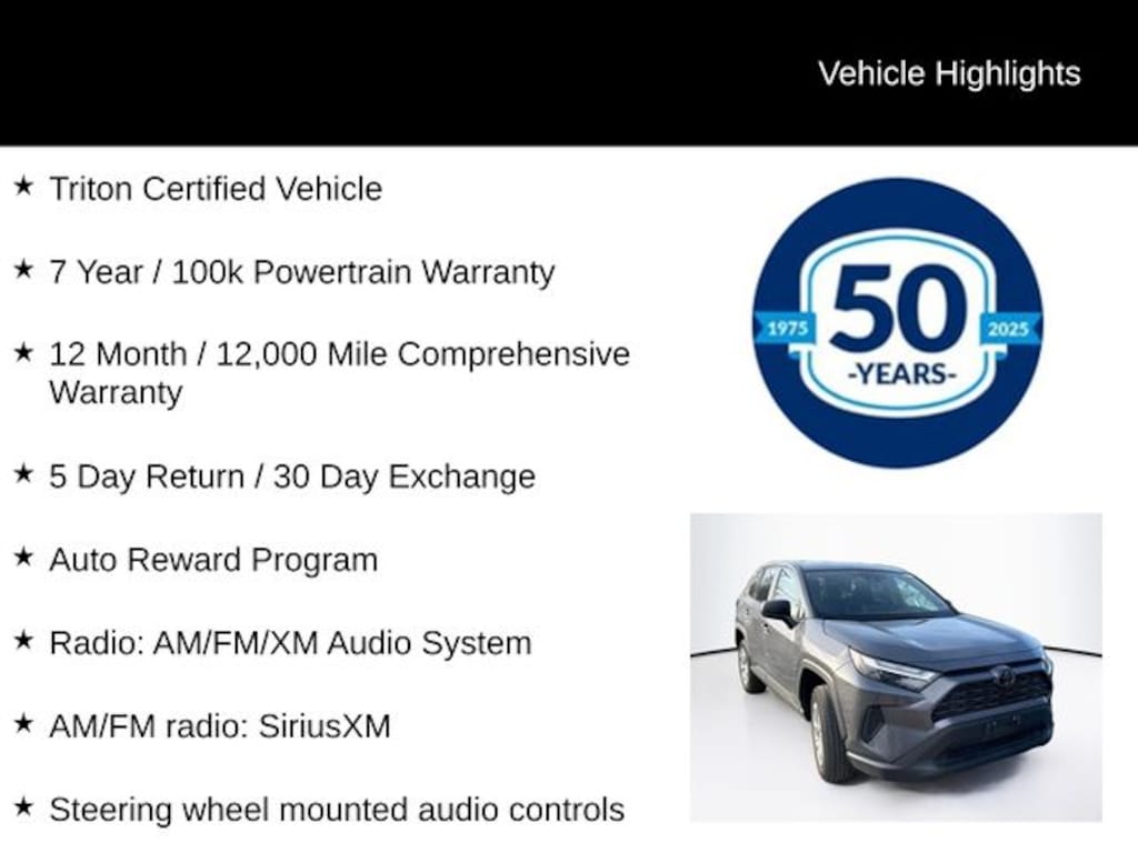 2024 Toyota RAV4 LE 2.5L 4-Cylinder DOHC Dual VVT-i 8-Speed Automatic AWD 4D Sport Utility Gray Triton Certified Vehicle, 7 Year / 100k Powertrain Warranty, 12 Month / 12,000 Mile Comprehensive Warranty, 5 Day Return / 30 Day Exchange, Auto Reward Program, AWD, Black w/Fabric Seat Trim, AM/FM radio: SiriusXM, Auto High-beam Headlights, Exterior Parking Camera Rear, Power door mirrors, Radio: AM/FM/XM Audio System, Remote keyless entry, Steering wheel mounted audio controls.