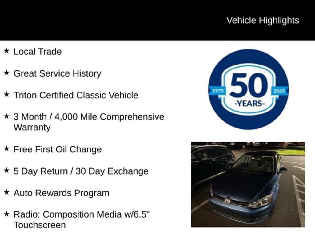 Recent Arrival! 2017 Volkswagen Golf TSI S 4-Door TSI S 4-Door 1.8L I4 Turbocharged DOHC 16V SULEV II 170hp 5-Speed Manual FWD 4D Hatchback Blue Metallic Local Trade, Great Service History, Triton Certified Classic Vehicle, 3 Month / 4,000 Mile Comprehensive Warranty, Free First Oil Change, 5 Day Return / 30 Day Exchange, Auto Rewards Program, Black Cloth, Alloy wheels, Cloth Seating Surfaces, Exterior Parking Camera Rear, Heated door mirrors, Illuminated entry, Leather Shift Knob, Leather steering wheel, Power door mirrors, Radio: Composition Media w/6.5" Touchscreen, Remote keyless entry, Steering wheel mounted audio controls, Turn signal indicator mirrors.