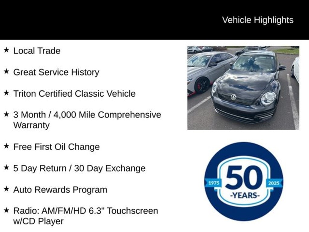 Recent Arrival! 2018 Volkswagen Beetle 2.0T Coast 2.0T Coast 2.0L TSI 6-Speed Automatic with Tiptronic FWD 2D Hatchback Deep Black Pearl Metallic Local Trade, Great Service History, Triton Certified Classic Vehicle, 3 Month / 4,000 Mile Comprehensive Warranty, Free First Oil Change, 5 Day Return / 30 Day Exchange, Auto Rewards Program, Dune Gray/Black Cloth, 17" Heritage Alloy Wheels, Electronic Stability Control, Exterior Parking Camera Rear, Fully automatic headlights, Heated door mirrors, Heated Front Comfort Seats, Heated front seats, Illuminated entry, Leather Shift Knob, Leather steering wheel, Pepita 2-Tone Cloth Seating Surfaces, Power door mirrors, Power moonroof, Radio: AM/FM/HD 6.3" Touchscreen w/CD Player, Rain sensing wipers, Remote keyless entry, Steering wheel mounted audio controls, Turn signal indicator mirrors.