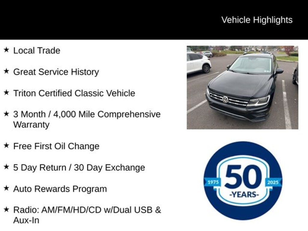 Recent Arrival! 2018 Volkswagen Tiguan 2.0T SE 4Motion 2.0T SE 2.0L TSI DOHC 8-Speed Automatic with Tiptronic AWD 4D Sport Utility Black Local Trade, Great Service History, Triton Certified Classic Vehicle, 3 Month / 4,000 Mile Comprehensive Warranty, Free First Oil Change, 5 Day Return / 30 Day Exchange, Auto Rewards Program, AWD, Alloy wheels, Electronic Stability Control, Exterior Parking Camera Rear, Front dual zone A/C, Fully automatic headlights, Heated door mirrors, Heated front seats, Illuminated entry, Leather Shift Knob, Perforated V-Tex Leatherette Seating Surfaces, Power driver seat, Radio: AM/FM/HD/CD w/Dual USB & Aux-In, Remote keyless entry, Steering wheel mounted audio controls, Turn signal indicator mirrors.