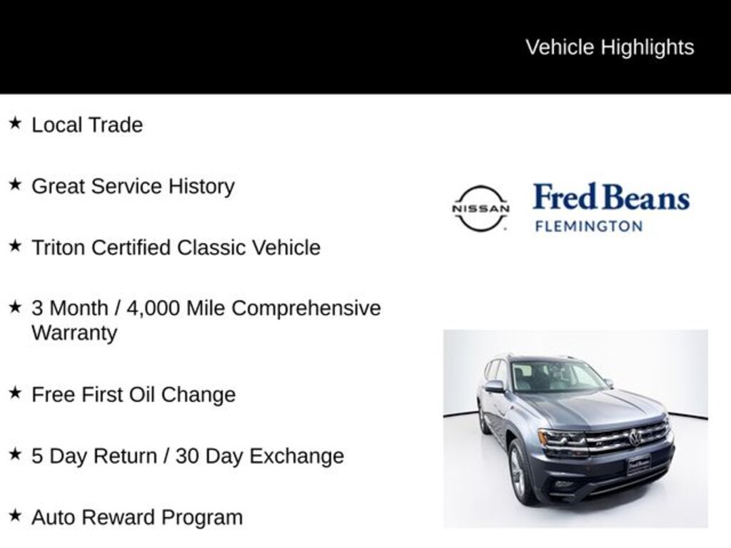 2019 Volkswagen Atlas 3.6L V6 SE R-Line 3.6L V6 SE 3.6L VR6 8-Speed Automatic with Tiptronic AWD 4D Sport Utility Platinum Gray Metallic Local Trade, Great Service History, Triton Certified Classic Vehicle, 3 Month / 4,000 Mile Comprehensive Warranty, Free First Oil Change, 5 Day Return / 30 Day Exchange, Auto Reward Program.
