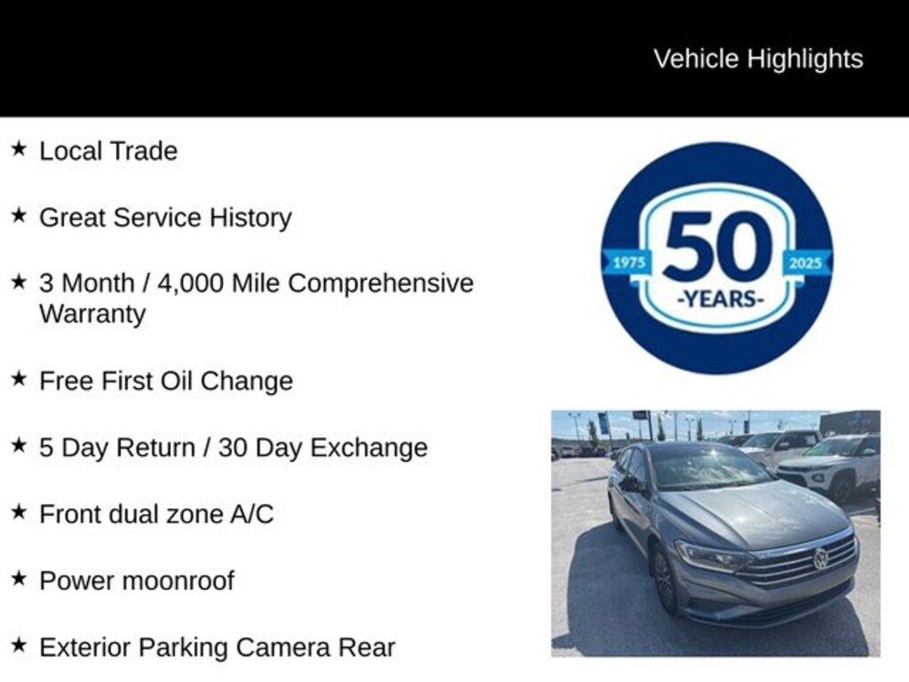 Recent Arrival! 2019 Volkswagen Jetta SEL 1.4L TSI 8-Speed Automatic with Tiptronic FWD 4D Sedan Platinum Gray Metallic Local Trade, Great Service History, 3 Month / 4,000 Mile Comprehensive Warranty, Free First Oil Change, 5 Day Return / 30 Day Exchange, Dark Beige Premium Synthetic, Exterior Parking Camera Rear, Front dual zone A/C, Heated Front Comfort Seats, Perforated V-Tex Leatherette Seat Trim, Power moonroof.