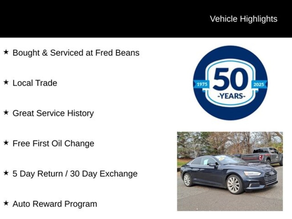 Recent Arrival! 2018 Audi A5 2.0T Premium quattro 2.0L 4-Cylinder TFSI 7-Speed Automatic S tronic 2D Coupe Moonlight Blue Metallic Bought & Serviced at Fred Beans, Local Trade, Great Service History, Free First Oil Change, 5 Day Return / 30 Day Exchange, Auto Reward Program, A5 2.0T Premium quattro, 2D Coupe, 2.0L 4-Cylinder TFSI, 7-Speed Automatic S tronic, quattro, Moonlight Blue Metallic, Brown Leather. 24/34 City/Highway MPG