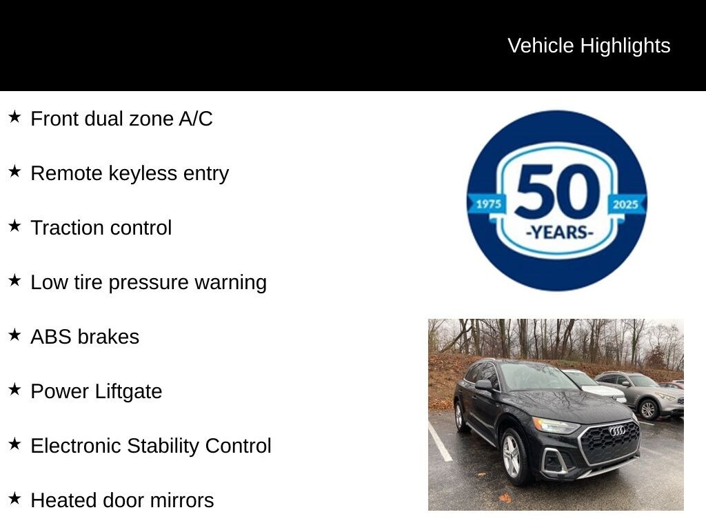 Recent Arrival! 2023 Audi Q5 e 55 Premium Plus S Line 2.0L Turbocharged 7-Speed Automatic S tronic quattro 4D Sport Utility Mythos Black Metallic ABS brakes, Alloy wheels, Compass, Electronic Stability Control, Front dual zone A/C, Heated door mirrors, Heated front seats, Illuminated entry, Low tire pressure warning, Power Liftgate, Remote keyless entry, Traction control.