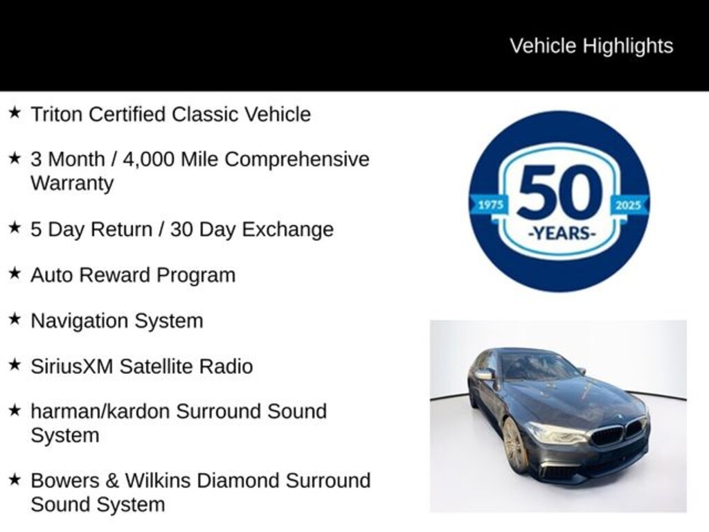 Recent Arrival! 2018 BMW 5 Series M550i xDrive 4.4L V8 Turbocharged DOHC 32V LEV3-ULEV125 456hp 8-Speed Automatic AWD 4D Sedan Carbon Black Metallic Triton Certified Classic Vehicle, 3 Month / 4,000 Mile Comprehensive Warranty, 5 Day Return / 30 Day Exchange, Auto Reward Program, AWD, Black Leather, Advanced Real Time Traffic Information, AM/FM radio: SiriusXM, Apple CarPlay Compatibility, Automatic temperature control, Bowers & Wilkins Diamond Surround Sound System, Exterior Parking Camera Rear, Front dual zone A/C, harman/kardon Surround Sound System, Head-Up Display, Memory seat, Navigation System, Power driver seat, Power Front Seats, Power moonroof, Rain sensing wipers, Remote keyless entry, SiriusXM Satellite Radio, Soft-Close Automatic Doors, Steering wheel memory, Steering wheel mounted audio controls.