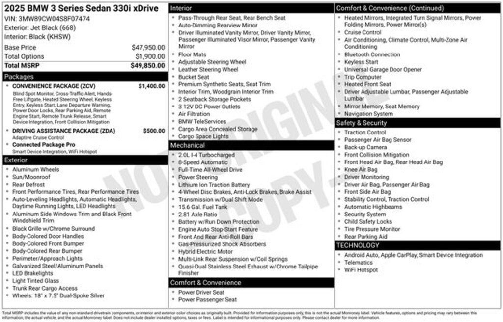 This 2025 BMW 3 Series 330i xDrive is more than just a car â" it's an opportunity to elevate your driving experience and make a statement. With its unparalleled performance, advanced technology, and impeccable craftsmanship, this vehicle is poised to exceed your expectations and become the centerpiece of your automotive journey. Visit our showroom today and let us help you discover the true power of the 3 Series.