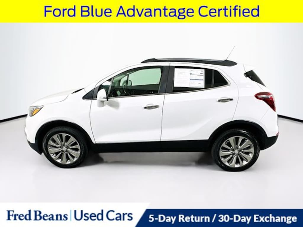 2019 Buick Encore Preferred ECOTEC 1.4L I4 SMPI DOHC Turbocharged VVT 6-Speed Automatic Electronic with Overdrive FWD 4D Sport Utility Summit White Local Trade, 3 Month / 4,000 Mile Comprehensive Warranty, Ford Blue Advantage Certified, 120-Volt Power Outlet, Alloy wheels, AM/FM radio: SiriusXM, Apple CarPlay/Android Auto, Cloth w/Leatherette Seat Trim, Exterior Parking Camera Rear, Front Bucket Seats, Heated door mirrors, Power door mirrors, Power driver seat, Power Tilt-Sliding Moonroof, Power windows, Preferred Equipment Group 1SB, Rear Cross Traffic Alert, Rear window defroster, Rear window wiper, Remote keyless entry, Safety Package, Side Blind Zone Alert, Speed control, Turn signal indicator mirrors. 25/30 City/Highway MPG