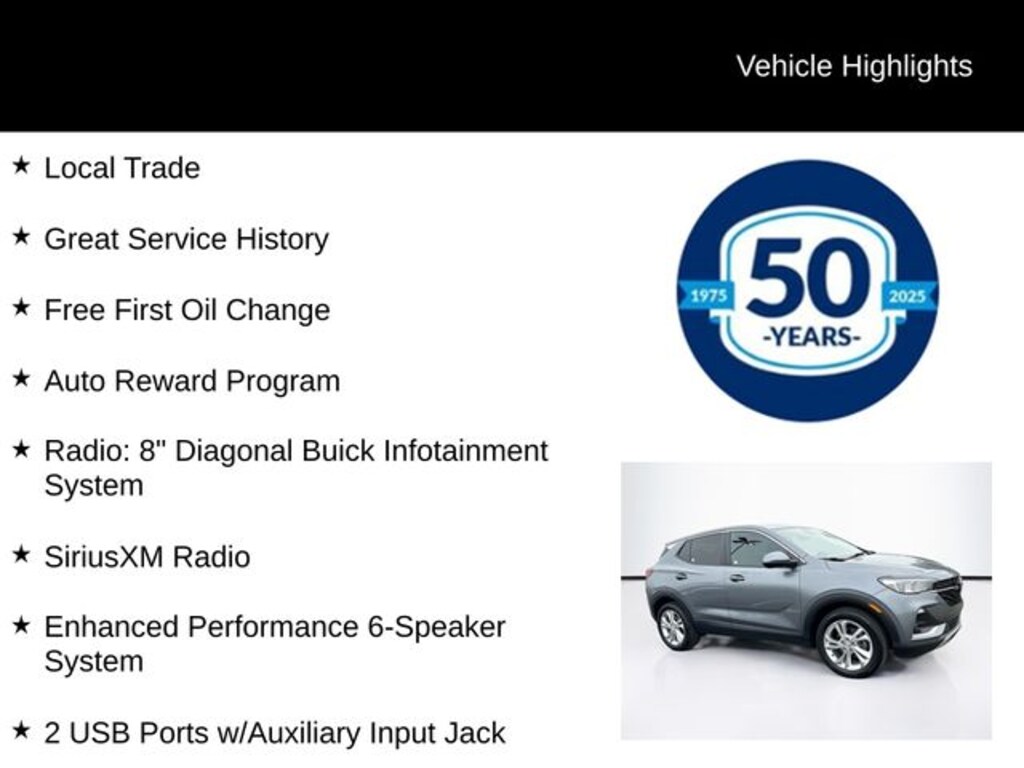 2021 Buick Encore GX Preferred ECOTEC 1.2L Turbo CVT FWD 4D Sport Utility Satin Steel Metallic Local Trade, Great Service History, Free First Oil Change, Auto Reward Program, 2 USB Ports w/Auxiliary Input Jack, Enhanced Performance 6-Speaker System, Front fog lights, Fully automatic headlights, Radio: 8" Diagonal Buick Infotainment System, Remote keyless entry, SiriusXM Radio, Wireless Apple CarPlay/Wireless Android Auto, 4-Way Manual Passenger Seat Adjuster, 4-Wheel Disc Brakes, 5.45 Final Drive Axle Ratio, 6 Speakers, 6-Way Manual Driver Seat Adjuster, ABS brakes, Air Conditioning, Alloy wheels, AM/FM radio: SiriusXM, Auto High-beam Headlights, Brake assist, Bumpers: body-color, Cloth w/Leatherette Seat Trim, Compass, Delay-off headlights, Driver door bin, Driver vanity mirror, Dual front impact airbags, Dual front side impact airbags, Electronic Stability Control, Emergency communication system: OnStar and Buick connected services capable, Front anti-roll bar, Front Bucket Seats, Front Center Armrest, Front reading lights, Front wheel independent suspension, Heated door mirrors, Illuminated entry, Knee airbag, Low tire pressure warning, Occupant sensing airbag, Outside temperature display, Overhead airbag, Overhead console, Panic alarm, Passenger door bin, Passenger vanity mirror, Power door mirrors, Power steering, Power windows, Preferred Equipment Group 1SB, Radio data system, Rear reading lights, Rear side impact airbag, Rear window defroster, Rear window wiper, Ride & Handling Suspension, Security system, Speed control, Speed-sensing steering, Split folding rear seat, Spoiler, Steering wheel mounted audio controls, Tachometer, Telescoping steering wheel, Tilt steering wheel, Traction control, Trip computer, Variably intermittent wipers, Wheels: 18" Bright Silver Painted Aluminum, 2 USB Ports w/Auxiliary Input Jack, Enhanced Performance 6-Speaker System, Front fog lights, Fully automatic headlights, Radio: 8" Diagonal Buick Infotainment System, Remote keyless entry, SiriusXM Radio, Wireless Apple CarPlay/Wireless Android Auto.