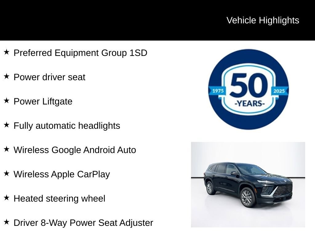 Experience the epitome of modern luxury and capability with the 2026 Buick Enclave Preferred. This stunning SUV is the perfect blend of style, performance, and cutting-edge technology, designed to elevate your driving experience.Boasting a bold, sophisticated exterior in the sleek Ebony Twilight Metallic color, the Enclave Preferred commands attention wherever it goes. Its impressive list of features includes:- All-Wheel Drive- Preferred Equipment Group 1SD- Power driver seat- Power Liftgate- Fully automatic headlights- Heated steering wheel- Wireless Apple CarPlay- Wireless Google Android Auto- Driver 8-Way Power Seat Adjuster- Front Passenger 4-Way Power Lumbar Seat Adjuster- Heated front seats- Leatherette Seat Trim- Wheels: 20 Alloy with Medium Android FinishStep inside the Enclave Preferred and you'll be greeted by a meticulously crafted interior that combines premium materials and advanced technology. The Bose Premium 12-Speaker Audio System with Subwoofer delivers an immersive listening experience, while the Buick Infotainment System with wireless connectivity keeps you seamlessly connected on the go.Powered by a 2.5L DOHC engine paired with an 8-Speed Automatic transmission and All-Wheel Drive, the Enclave Preferred offers a dynamic and responsive driving experience. With an impressive EPA-estimated fuel economy of 20 MPG in the city and 24 MPG on the highway, you can enjoy your journeys with confidence and efficiency.Safety is paramount in the Enclave Preferred, which comes equipped with a comprehensive suite of advanced driver-assistance features. From Automatic Emergency Braking to Lane Departure Warning and Rear Cross-Traffic Alert, you can navigate the roads with peace of mind.Whether you're embarking on a family adventure or seeking a premium daily driver, the 2026 Buick Enclave Preferred is the perfect choice. Experience the epitome of modern luxury and capability today. Visit our showroom and let us demonstrate how this exceptional SUV can enhance your driving experience.