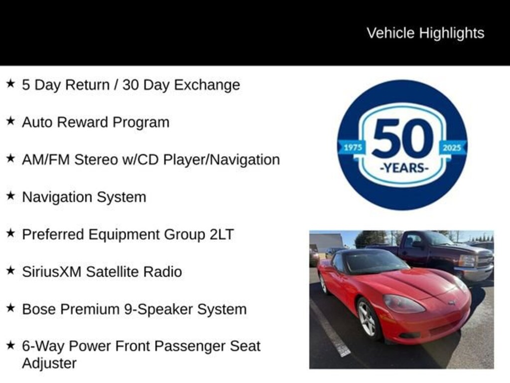 Discover the ultimate driving experience with this stunning 2013 Chevrolet Corvette Base 2LT. This sports car is a true testament to Chevrolet's engineering prowess, offering a thrilling blend of power, style, and advanced technology.Key features of this exceptional vehicle include: 5 Day Return / 30 Day Exchange Auto Reward Program 2LT PREFERRED EQUIPMENT GROUP 6-Speed Automatic with Paddle Shift 1-Piece Transparent Removable Roof Panel Cross-Drilled Larger Front & Rear Brake Rotors Battery Protection Package AM/FM Stereo with CD Player and Navigation Bose Premium 9-Speaker Sound System SiriusXM Satellite Radio 6-Way Power Front Passenger Seat Adjuster Bluetooth® for Phone Head-Up Display Cargo Net & Luggage ShadePowered by a 6.2L V8 SFI engine and delivering an impressive 15 city / 25 highway MPG, this Corvette offers a thrilling driving experience without sacrificing efficiency. The 6-speed automatic transmission with paddle shifters provides seamless gear changes and enhanced control, while the sport-tuned suspension and cross-drilled brake rotors ensure exceptional handling and braking performance.Inside, the Corvette's 2LT Preferred Equipment Group pampers you with luxurious leather seating, a Bose premium sound system, and a host of advanced technology features. The head-up display projects vital information directly onto the windshield, allowing you to keep your eyes on the road, while the Bluetooth® connectivity and SiriusXM satellite radio keep you connected and entertained.Whether you're carving through winding roads or cruising down the highway, this 2013 Chevrolet Corvette Base 2LT will captivate your senses and leave a lasting impression. Experience the power, style, and sophistication that have made the Corvette an American icon. Visit our showroom today and let us demonstrate why this exceptional sports car should be your next automotive investment.