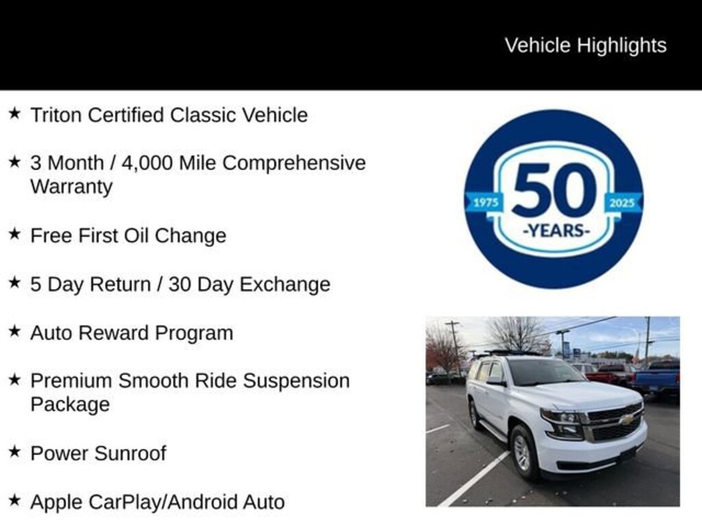Clean CARFAX.Recent Arrival! 2018 Chevrolet Tahoe LT EcoTec3 5.3L V8 6-Speed Automatic Electronic with Overdrive 4WD 4D Sport Utility Summit White Triton Certified Classic Vehicle, 3 Month / 4,000 Mile Comprehensive Warranty, Free First Oil Change, 5 Day Return / 30 Day Exchange, Auto Reward Program, 4WD, Black Leather, Apple CarPlay/Android Auto, Power Sunroof, Premium Smooth Ride Suspension Package.Odometer is 12854 miles below market average!Certified. Certification Program Details: Triton Certified Shield Classic 3-Month or 4,000-Mile Comprehensive Coverage ($100 deductible) 100+ Multipoint Inspection PA State Inspection & Emissions Test Oil, Lube, & Filter Service Completed 5-Day Return Policy1 30-Day Exchange Policy2 CARFAXTM Report AutoRewards Membership See salesperson for additional offers & complete details.For better peace of mind all our used vehicles have a 127-point inspection and come with a 5-day return, 30-day exchange (As-Is vehicles are excluded). Our exclusive Auto Rewards Program provides better value with Free First Oil change, Free Pa State Safety inspections, discounts for local merchants and more. Plus, you can earn up to $2000 towards your next vehicle just by servicing with Fred Beans! As Fred Beans always says, our used cars are better because our reputation depends on it.Awards:* JD Power Dependability Study * 2018 KBB.com 5-Year Cost to Own Awards * 2018 KBB.com Best Family Cars * 2018 KBB.com Best Resale Value Awards * 2018 KBB.com 10 Most Awarded BrandsAlthough every reasonable effort has been made to ensure the accuracy of the information contained on this site, absolute accuracy cannot be guaranteed. This site, and all information and materials appearing on it, are presented to the user as is without warranty of any kind, either express or implied. All vehicles are subject to prior sale. Price does not include applicable tax, title, license, processing and/or documentation fees. Vehicles shown at different locations are not currently in our inventory (Not in Stock) but can be made available to you at our location within a reasonable date from the time of your request, not to exceed one week. Residency restrictions may apply.