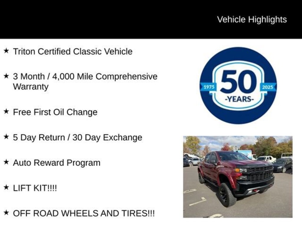 Clean CARFAX. CARFAX One-Owner.Recent Arrival! 2020 Chevrolet Silverado 1500 Custom Trail Boss EcoTec3 5.3L V8 6-Speed Automatic Electronic with Overdrive 4WD 4D Crew Cab Cajun Red Tintcoat Triton Certified Classic Vehicle, 3 Month / 4,000 Mile Comprehensive Warranty, Free First Oil Change, 5 Day Return / 30 Day Exchange, Auto Reward Program, LIFT KIT!!!!, OFF ROAD WHEELS AND TIRES!!!, 6-Speed Automatic Electronic with Overdrive, 4WD, Black Cloth.Odometer is 23274 miles below market average!Certified. Certification Program Details: Triton Certified Shield Classic 3-Month or 4,000-Mile Comprehensive Coverage ($100 deductible) 100+ Multipoint Inspection PA State Inspection & Emissions Test Oil, Lube, & Filter Service Completed 5-Day Return Policy1 30-Day Exchange Policy2 CARFAXTM Report AutoRewards Membership See salesperson for additional offers & complete details.For better peace of mind all our used vehicles have a 127-point inspection and come with a 5-day return, 30-day exchange (As-Is vehicles are excluded). Our exclusive Auto Rewards Program provides better value with Free First Oil change, Free Pa State Safety inspections, discounts for local merchants and more. Plus, you can earn up to $2000 towards your next vehicle just by servicing with Fred Beans! As Fred Beans always says, our used cars are better because our reputation depends on it.Although every reasonable effort has been made to ensure the accuracy of the information contained on this site, absolute accuracy cannot be guaranteed. This site, and all information and materials appearing on it, are presented to the user as is without warranty of any kind, either express or implied. All vehicles are subject to prior sale. Price does not include applicable tax, title, license, processing and/or documentation fees. Vehicles shown at different locations are not currently in our inventory (Not in Stock) but can be made available to you at our location within a reasonable date from the time of your request, not to exceed one week. Residency restrictions may apply.