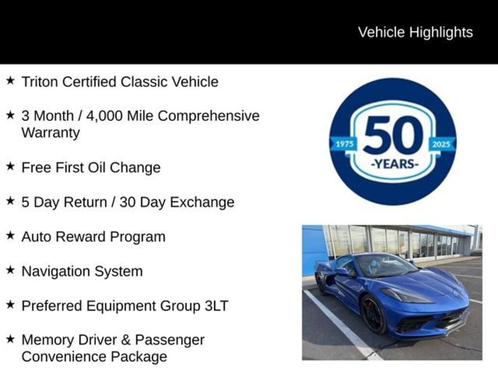 What sets this Corvette apart is its Triton Certified status, which means it has undergone a rigorous inspection and reconditioning process to ensure it meets the highest standards of quality and reliability. With a comprehensive 3-month/4,000-mile warranty and a free first oil change, you can drive with confidence knowing that your investment is protected.