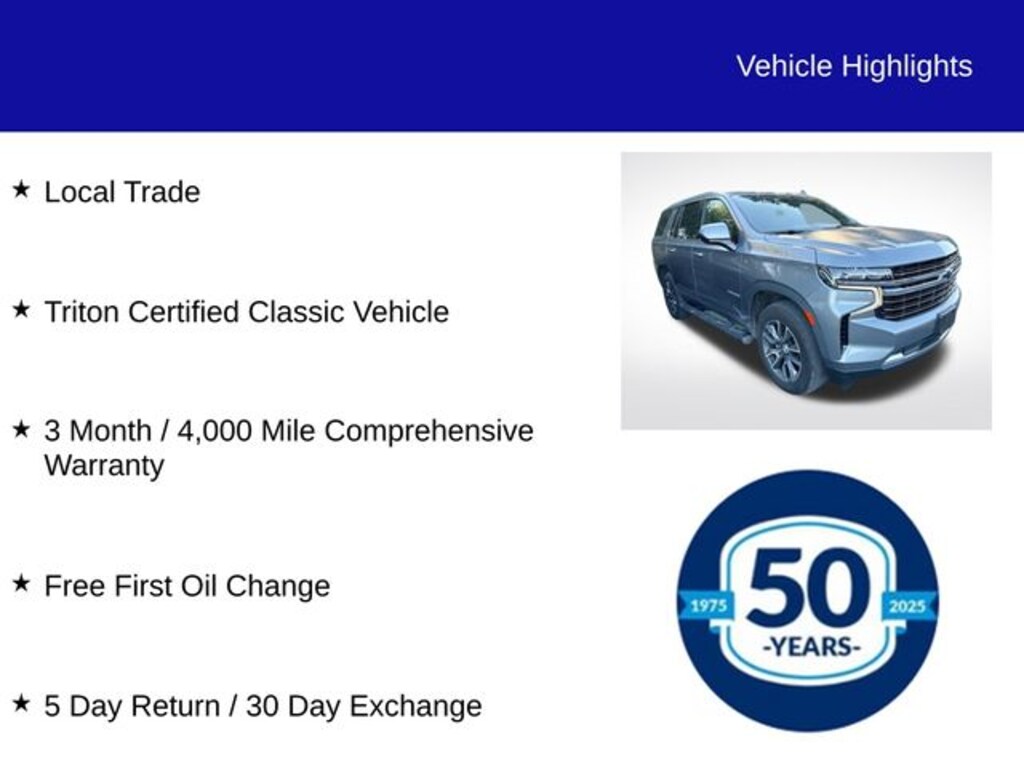 Recent Arrival! 2021 Chevrolet Tahoe LT EcoTec3 5.3L V8 10-Speed Automatic with Overdrive 4WD 4D Sport Utility Satin Steel Metallic Local Trade, Triton Certified Classic Vehicle, 3 Month / 4,000 Mile Comprehensive Warranty, Free First Oil Change, 5 Day Return / 30 Day Exchange, 4WD, Black Leather, 10-Way Power Driver & Passenger Seat Adjusters, 1st & 2nd Row Color-Keyed Carpeted Floor Mats, 1st & 2nd Rows All-Weather Floor Liners (LPO), 2 USB Data Ports, 2nd Row Manual Bucket Seats, 3.23 Rear Axle Ratio, 3rd row seats: split-bench, 4-Wheel Disc Brakes, 9 Speakers, ABS brakes, Air Conditioning, Alloy wheels, AM/FM radio: SiriusXM with 360L, Apple CarPlay/Android Auto, Auto High-beam Headlights, Auto-Dimming Inside Rear-View Mirror, Auto-dimming Rear-View mirror, Automatic temperature control, Bose 9-Speaker Stereo Audio System Feature, Brake assist, Bright Front & Rear Door Sill Plates, Bumpers: body-color, Color-Keyed Carpeting Floor Covering, Compass, Delay-off headlights, Driver & Front Outboard Passenger Airbags, Driver door bin, Driver vanity mirror, Dual front impact airbags, Dual front side impact airbags, Dual-Pane Power Panoramic Sunroof, Electronic Stability Control, Emergency communication system: OnStar and Chevrolet connected services capable, Floor Console w/Storage Area, Four wheel independent suspension, Front anti-roll bar, Front Bucket Seats, Front Center Armrest, Front dual zone A/C, Front High-Back Reclining Bucket Seats, Front reading lights, Fully automatic headlights, Garage door transmitter, Hands-Free Rear Power Programmable Liftgate, HD Radio, Heated door mirrors, Heated Driver & Front Passenger Seats, Heated front seats, Illuminated entry, Infotainment Display, Leather Seat Trim, Leather steering wheel, Leather-Wrapped Steering Wheel, LED Daytime Running Lamps, License Plate Front Mounting Package, Low tire pressure warning, Memory seat, Memory Settings for Driver, Not Equipped w/Automatic Stop/Start, Not Equipped w/Steering Column Lock, Not Equipped w/Wireless Charging, Occupant sensing airbag, Outside temperature display, Overhead airbag, Overhead console, Panic alarm, Passenger door bin, Passenger vanity mirror, Power door mirrors, Power driver seat, Power Liftgate, Power passenger seat, Power steering, Power windows, Preferred Equipment Group 1LT, Premium audio system: Chevrolet Infotainment 3, Premium Smooth Ride Suspension, Radio: Chevrolet Infotainment 3 Plus System, Rain sensing wipers, Rear air conditioning, Rear anti-roll bar, Rear reading lights, Rear seat center armrest, Rear window defroster, Rear window wiper, Remote keyless entry, Remote Start, Roof rack: rails only, Security system, SiriusXM Radio w/360L, Speed control, Speed-sensing steering, Split folding rear seat, Spoiler, Steering wheel mounted audio controls, Tachometer, Telescoping steering wheel, Tilt steering wheel, Traction control, Trip computer, Universal Home Remote, Variably intermittent wipers, Voltmeter, Wheels: 18" x 8.5" Bright Silver Painted Aluminum, Wheels: 20" x 9" Painted Aluminum, 4WD, Black Leather.