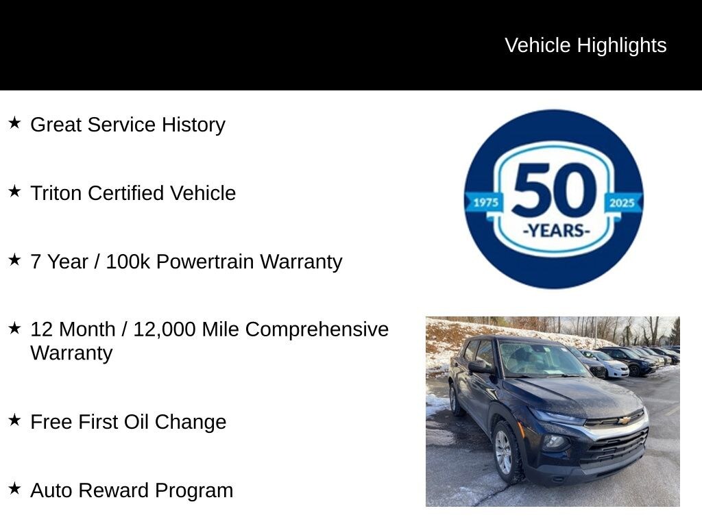 Recent Arrival! 2021 Chevrolet TrailBlazer LS 1.2L Ecotec Turbo DOHC DI w/VVT CVT FWD 4D Sport Utility Midnight Blue Metallic Great Service History, Triton Certified Vehicle, 7 Year / 100k Powertrain Warranty, 12 Month / 12,000 Mile Comprehensive Warranty, Free First Oil Change, Auto Reward Program.