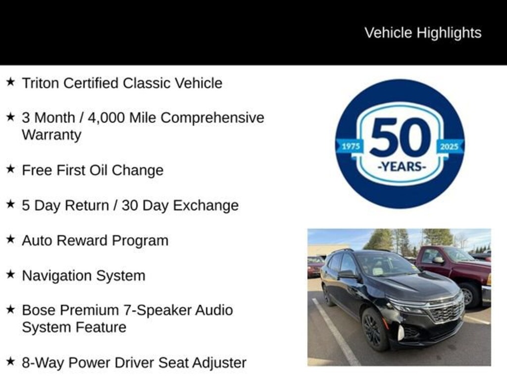 This Equinox RS is more than just a vehicle it's a testament to Chevrolet's commitment to excellence. As a Triton Certified Classic Vehicle, it has undergone a rigorous inspection and comes with a comprehensive warranty, ensuring your peace of mind. With features like the power sunroof, heated steering wheel, and advanced safety technologies, this Equinox RS is the ultimate blend of style, performance, and convenience.