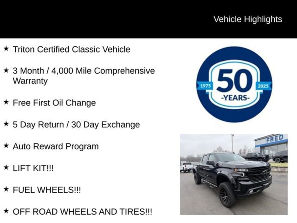 Clean CARFAX. CARFAX One-Owner.Recent Arrival! 2022 Chevrolet Silverado 1500 LTD RST EcoTec3 5.3L V8 8-Speed Automatic 4WD 4D Crew Cab Black Triton Certified Classic Vehicle, 3 Month / 4,000 Mile Comprehensive Warranty, Free First Oil Change, 5 Day Return / 30 Day Exchange, Auto Reward Program, LIFT KIT!!!, FUEL WHEELS!!!, OFF ROAD WHEELS AND TIRES!!!, CUSTOM FENDER FLARES!!, All-Star Edition.Odometer is 15847 miles below market average!Certified. Certification Program Details: Triton Certified Shield Classic 3-Month or 4,000-Mile Comprehensive Coverage ($100 deductible) 100+ Multipoint Inspection PA State Inspection & Emissions Test Oil, Lube, & Filter Service Completed 5-Day Return Policy1 30-Day Exchange Policy2 CARFAXTM Report AutoRewards Membership See salesperson for additional offers & complete details.For better peace of mind all our used vehicles have a 127-point inspection and come with a 5-day return, 30-day exchange (As-Is vehicles are excluded). Our exclusive Auto Rewards Program provides better value with Free First Oil change, Free Pa State Safety inspections, discounts for local merchants and more. Plus, you can earn up to $2000 towards your next vehicle just by servicing with Fred Beans! As Fred Beans always says, our used cars are better because our reputation depends on it.Although every reasonable effort has been made to ensure the accuracy of the information contained on this site, absolute accuracy cannot be guaranteed. This site, and all information and materials appearing on it, are presented to the user as is without warranty of any kind, either express or implied. All vehicles are subject to prior sale. Price does not include applicable tax, title, license, processing and/or documentation fees. Vehicles shown at different locations are not currently in our inventory (Not in Stock) but can be made available to you at our location within a reasonable date from the time of your request, not to exceed one week. Residency restrictions may apply.